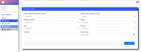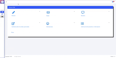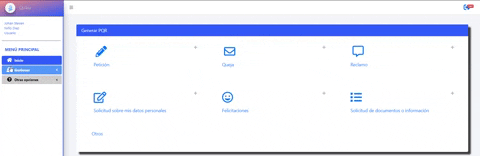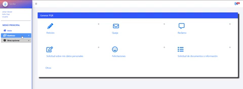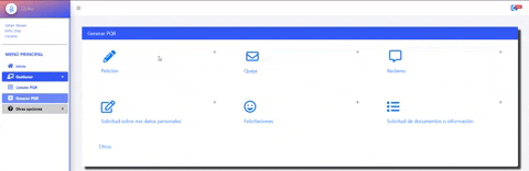 3- En la pantalla de generar PQR selecciona uno de las opciones (Petición, Queja, Reclamo, Solicitud sobre mis datos personales, Felicitaciones, Solicitud de documentos o información)